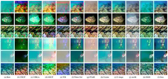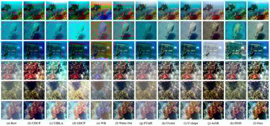 Figure 8 shows the experimental results of different methods on the EUVP dataset. It can be seen from the figure that UDCP and WB fail to effectively solve the color deviation problem and introduce abnormal tones. Although UIBLA and GDCP enhance the contrast of the image, the brightness enhancement is too high. The WaterNet, Ucolor, U-shape, and AoSR methods can correct the color deviation to a certain extent, but they cannot effectively improve the blur phenomenon of the image. The dehazing effect of the FUnIE method is not good, and the fourth and fifth lines are more obvious. In addition, the enhancement effect of the DGD method is not good, and the enhanced image is still blurred, and the color distortion is obvious. Compared with the above methods, our proposed MCFR-Net performs better in resolving image blur, and the enhanced images have realistic colors and significantly improved contrast, as shown in the second-, fourth-, and fifth-row images.