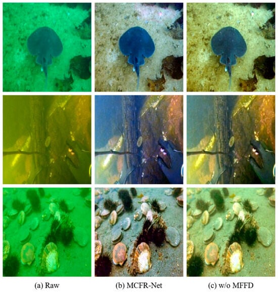 Figure 9 shows the ablation of the MFFD module. The first column is the original image, the second column is the MCFR-Net enhancement result, and the third column is the ablation result after removing the MFFD module. It can be seen that the original image has obvious color distortion, low contrast, and missing details. In the absence of the MFFD module, although the contrast is improved, the overall detail performance is still not ideal. For example, the edge of the stingray in the first row is still blurred, the structure details of the underwater object in the second row are not clear, and the details of shells and sea urchins in the third row are blurred. In contrast, the complete MCFR-Net shows clearer edges and more realistic colors. This shows that the MFFD module can effectively fuse multi-scale features and significantly improve the detail performance and overall visual quality of the image.