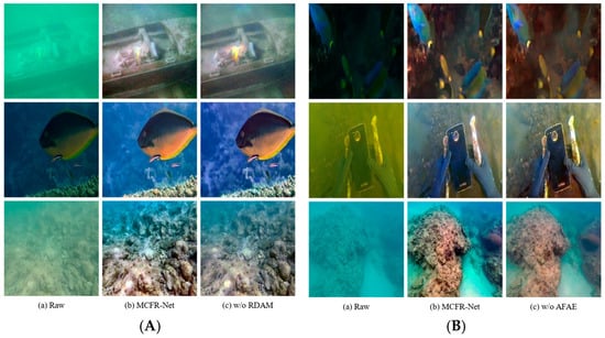 Figure 10 illustrates the ablation of the RDAM and the AFAE module. As shown in Figure 10A, after removing the RDAM, the contrast between the detailed feature expression of key targets and the background area is weakened. For example, the seabed rocks and corals in the third row of the third column lack details and clarity. In contrast, the complete MCFR-Net provides clearer and more detailed images, indicating that the RDAM can significantly improve the detailed expression and color stability of the key regions in the images. As shown in Figure 10B, after removing the AFAE module, although the overall image quality is improved to some extent compared to the original samples, the detail clarity is inferior to the complete MCFR-Net. This confirms that the AFAE module plays a key role in enhancing the local details.