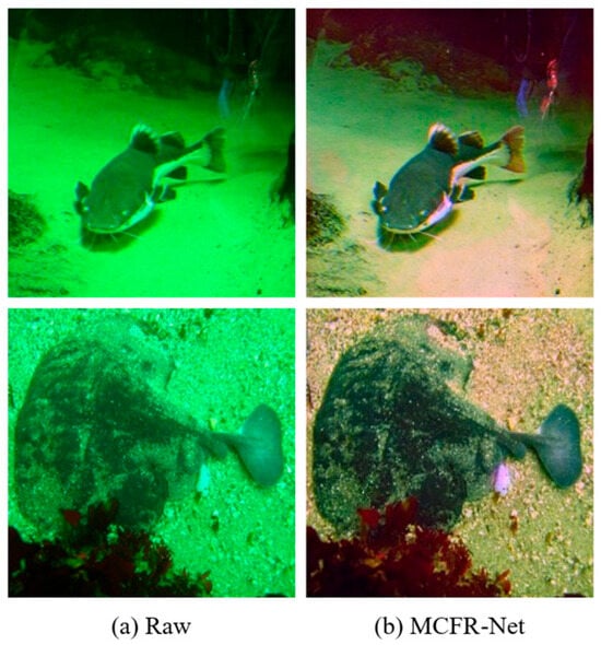 Our MCFR-Net shows some shortcomings when dealing with some underwater images with serious color deviation, as shown in Figure 11. The first column is the original underwater image, and the second column is the corresponding enhanced result. It can be seen from the figure that MCFR-Net shows color distortion in local regions during the enhancement process, such as purple bias in the fish body region in the first row of the second column. Therefore, in future research, we will introduce a color correction algorithm to improve the restoration effect under severe color cast conditions.