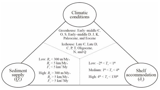 Ternary diagram classifying shelf-margin architectural styles using sediment supply, accommodation space, and climatic conditions as classification axes.