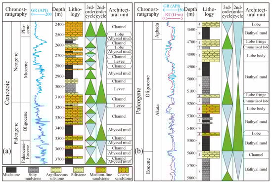 In the Niger Delta Basin, the main vertical lithofacies include fan lobes, channels, and semi-deep-sea mud (Figure 4b). Fan lobes can be divided into single lobes and lobe complexes. Single lobes have thinner sand bodies, generally fine- to silt-grained sandstone interlayered with mudstone, with a cumulative sandstone thickness of 15–25 m and a sand-to-mud ratio of 30–50%. Lobe complexes have thicker sand bodies, mainly composed of lobe bodies, channelized lobes, and lobe margins, generally thick medium- to fine-grained sandstone interbedded with thin-layered mudstone, with a maximum cumulative sandstone thickness of 80 m and a sand-to-mud ratio of 50–70%. Sedimentary channels consist of thick medium- to fine-grained sandstone interbedded with thin-layered mudstone, with a cumulative sandstone thickness of 40–90 m and a sand-to-mud ratio of up to 80%.