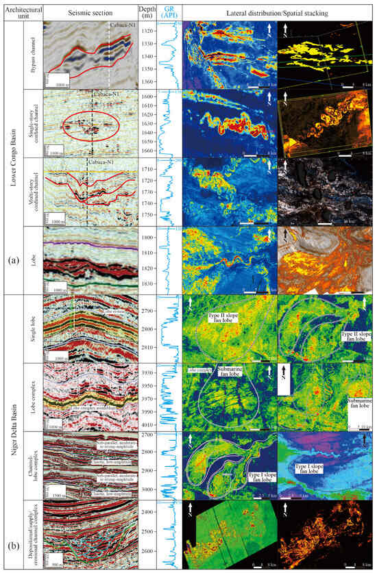 Seismic profiles, log responses, and spatial stacking patterns of sedimentary architecture units in the Lower Congo Basin (a) and the Niger Delta Basin (b).