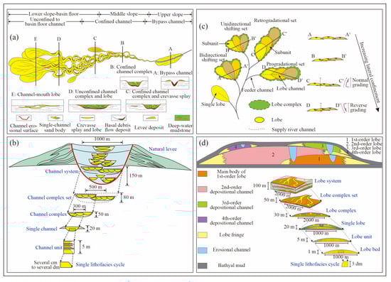 In the early stage of gravity flow formation, the fluid transport capacity is strong, and the erosion of the lower strata is obvious, leading to the phenomenon of sedimentary bypass. In the middle stage, the fluid energy gradually decreases, forming confined channels rich in basal lag deposits and slump debris flow deposits. In the late stage of gravity flow development, the energy carried by the fluid decreases, and sand-rich sediments begin to accumulate in the incised valley, forming high sand-to-mud ratio weakly confined stacked channels. As the fluid energy further decreases, fine-grained sediments gradually deposit, forming low sand-to-mud ratio channels and basin floor channel-end lobes [36,39] (Figure 6a). In the Lower Congo Basin during the late drift stage, the main architectural units are deep-water channel-levee systems, with proximal lobes composed of distributary channels and sheet sands, and distal lobes composed of thin-layered sheet fine sandstones and mudstone interlayers. Composite channels are an important component of deep-water channel sedimentary architecture, including layers (layer sets), channel units, and single channels (Figure 6b). In the Niger Delta Basin, the sedimentary architecture is mainly fan lobe systems, including medium-to-small scale submarine fans and small-scale slope fans. The key architectural unit, the lobe complex, includes four main types: single swing, double swing, retrogradational, and progradational (Figure 6c). Submarine fan lobe systems are supplied by gravity flow channels on the slope, rapidly depositing in the relatively gentle slope zone (slope fans) and abyssal plain area (submarine fans), exhibiting large-area continuous distributions in plan view [4,22]. The lobe systems are mainly distributed within parasequence sets, composed of multi-stage lobe complexes, with a vertical thickness of up to 100 m. The lithology inside the lobe system is diverse, mainly thick and stable medium-to-fine grained and medium-to-coarse grained sandstones, with a single layer thickness of 5–15 m, with local development of thin sand–mud interlayers. The lobe complex is a high-order level of the fan lobe system, including layers (layer sets), lobe units, and single lobes (Figure 6d). Lobe units embedded in the lobe complex can be locally identified by high-resolution seismic tools (such as seafloor stratigraphic profilers), such as modern lobe complexes [40,41].