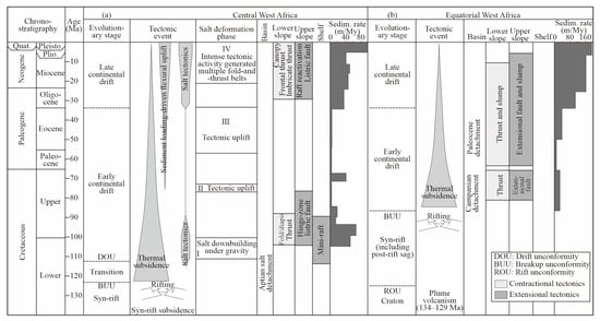 Tectonothermal evolution and gravity-driven deformation with sedimentation rate settings in the central (a) and equatorial (b) segments of West African passive margin basins.