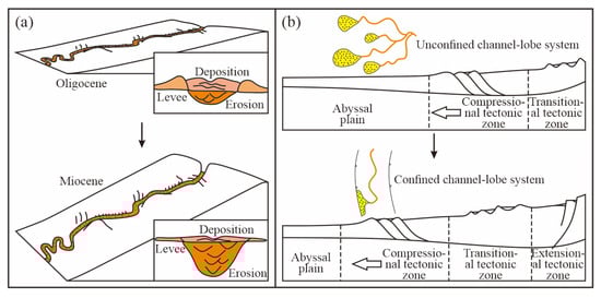 Since the Eocene, the Niger Delta Basin has formed a progradational delta. With the continuous accumulation and thickening of detritus on the margin, the transitional crust and the basin as a whole have continued to subside [45]. The basin as a whole continues to prograde in a step-like manner, with continuous evolution of sedimentary belts. Although the overall tectonic pattern changes little, the extensional, transitional, and compressional tectonic zones have developed in each period, and the location is constantly migrating towards the sea. This leads to a large difference in the sedimentary characteristics between the early deep-water sedimentary systems and the late deep-water sedimentary systems in the same location. The early abyssal plain area develops unconfined sedimentary systems, while the late stages form thrust-fold structures as the compressional tectonic zone migrates seaward, limiting the development range of gravity flow channels (Figure 8b).