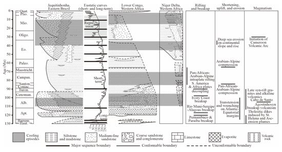 - Séranne, M.; Anka, Z. South Atlantic continental margins of Africa: A comparison of the tectonic vs climate interplay on the evolution of equatorial west Africa and SW Africa margins. J. Afr. Earth Sci. 2005, 43, 283–300. [Google Scholar] [CrossRef]