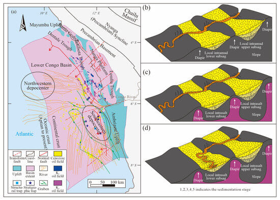 Oligocene–Miocene drainage distribution and basement paleouplift in the Lower Congo Basin (a), with mud/salt-diapir sub-basin fill patterns (b–d).