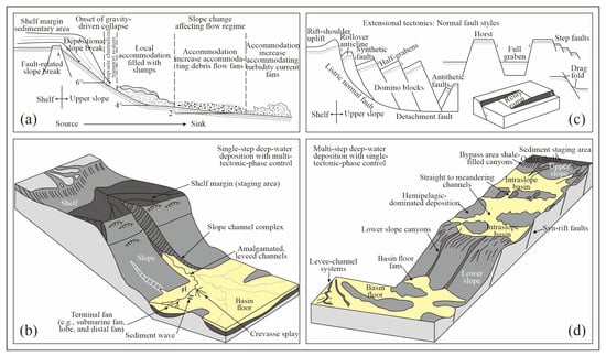 The Niger Fan is supplied by multiple points from the Niger River and the Niger Delta. Because the structural pattern of the slope is relatively complex, a multi-stage stepped slope is developed, but only a single-stage structural erosion has occurred (Figure 9). The sediments flow from the graben shoulder uplift of the shelf edge through the conversion slope to form a stepped upper slope, and finally extend to the deep sea or basin floor plain. The stepped upper slope is usually a domino-style fault block jointly composed of listric normal faults and detachment faults, including rolling anticlines, syn/antithetic faults, and half-grabens, or step-like faults formed by alternating horsts and grabens (Figure 11c). Since the Miocene, the Niger Delta Basin has continued to subside, the terrain is gentle, and the water flow is slow, leading to a lack of development of large canyons on the landward side of the Niger Fan, while mud and sand are easily deposited at the river mouth to form deltas. Under the gravity drive, terrestrial detritus is transported from the sediment accumulation area on the shelf edge to the deep-water area along the upper slope shale-filled canyons, straight-curved channels, and lower slope small canyon channels, forming a sheet-like deep-water submarine fan on the basin floor. Due to the gentle slope and the existence of synsedimentary stepped faults, some detrital materials are deposited in the intra-slope basins of the upper slope during the migration process to form slope fans, that is, “multi-step wide shelf-gentle slope unrooted deep-water fans” (Figure 11d). The fan root area of this type of deep-water fan does not develop large canyons and channels, and the fan middle and fan end mainly deposit lobe bodies, followed by deep-water channels [22].