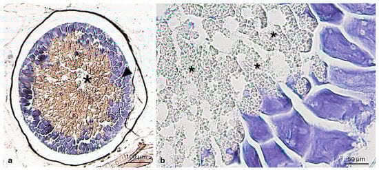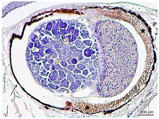 The photomicrograph shows a longitudinal section of lens filter of ventral photophore (ventral series IV) of I. ovatus. The asterisks indicate the reflector and the arrow designs the pigmented layer. Toluidine Blue stain.