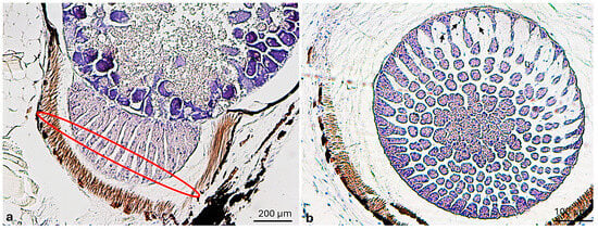 Immunofluorescence staining was carried out on the ventral body region of I. ovatus, corresponding to the main area of preserved photophores. Serial sections were deparaffinized, rehydrated, repeatedly rinsed in PBS/0.3% Triton X-100, and blocked in 2.5% bovine serum albumin (BSA) for 1 h. primary antibody incubation was carried out overnight at 4 °C in a humid chamber, using polyclonal rabbit anti-nNOS/NOS type I (BD Biosciences, Franklin Lakes, NJ, USA Cat. 610311) (dilution 1:250) and polyclonal rabbit S100 (Dako Glostrup, Denmark Cat. Z0311) (dilution 1:100). After incubation, the slides were washed and incubated for 2 h at room temperature with Alexa Fluor® 594 goat anti-rabbit IgG secondary antibody (Invitrogen, Carlsbad, CA, USA Cat. A32754) (dilution 1:300). Slides were subsequently washed and mounted using Fluoromount aqueous mounting medium to prevent photobleaching and cover-slipped [53]. Each image was rapidly acquired in order to minimize photodegradation. The slides were analyzed and images acquired using a Zeiss LSM DUO confocal laser scanning microscope equipped with a META module (Carl Zeiss MicroImaging GmbH, Jena, Germany) as quickly as possible to minimize fluorescence fading [54,55]. To provide negative controls, representative sections were incubated without primary antibodies with the same procedure described above. Under these conditions, no positive immunostaining was observed (Supplementary Materials, Figure S1).