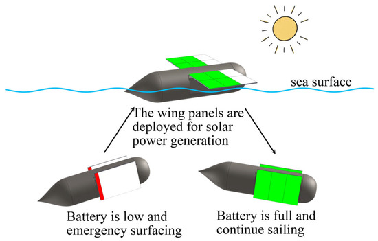 The energy constraints inherent in UUV design, arising from the necessity to integrate sensor suites while maintaining compact power sources, constitute a primary technical bottleneck impeding their operational scalability [3]. Regardless of the proliferation of high-energy-density batteries such as Mg-AgCl cells [4], lithium-ion systems [5], and fuel cells [6], these solutions remain insufficient to sustain the round-the-clock, long-duration missions demanded by contemporary oceanographic paradigms. There are two ways to solve this problem; one is to consider how to use external energy sources to power the UUV. UUVs can be powered by establishing a series of underwater charging stations, but this scheme has many disadvantages. First, conventional underwater charging methods typically rely on wet connectors, which are susceptible to corrosion and marine organisms clinging to them during long-term static immersion in seawater, affecting the reliability and safety of charging [7]. Secondly, the underwater charging process places extreme demands on the positioning accuracy of the UUV, especially when docked to a charging station, where any small deviation can cause a charging failure, which increases the difficulty and complexity of charging. Additionally, the complexity of the underwater environment, such as ocean currents, waves, and lighting conditions, can also interfere with the charging process, reducing charging efficiency and success rate [8]. Furthermore, underwater charging equipment is expensive to maintain and overhaul, and the repair process is complex and time-consuming in the event of a failure [9]. The above drawbacks limit the large-scale use of underwater charging stations, while the technology of power generation from environmental energy sources provides a new power supply scheme for UUVs [10]. Zhang [11] and Chen [12], et al., for example, proposed using wave energy for power generation devices but, constrained by the UUV’s internal space, its power generation would be small and would need to involve a three-stage energy conversion device. Its system complex conversion efficiency is low compared to other wave energy-using devices, whereas solar-powered devices, such as SAUV-I and SAUV-II developed by the United States Naval Research Agency [13], with their simple structure and high power generation, are a potential technology [14]. In addition, with advances in photovoltaic panel technology, scholars are currently demonstrating that using solar power to power UUVs near water is a more feasible method, and Rohr et al. have shown that solar panels made using broadband gap semiconductors can achieve efficient power generation within 50 m underwater [15].
