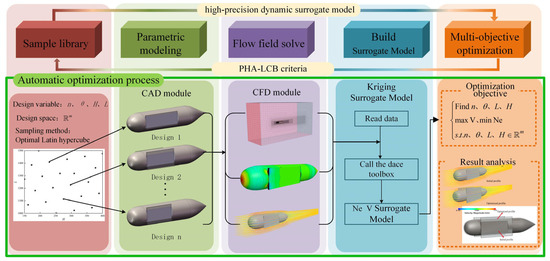 In this study, a foldable solar panel integrated into a UUV was designed by combining the two approaches to enhance UUV endurance. It deploys during near-surface charging and retracts during underwater navigation, as shown in Figure 1. The shape of the photovoltaic-powered UUV was optimized following the workflow illustrated in Figure 2. With 24 h energy consumption and cabin volume as optimization objectives, navigation resistance and theoretical solar panel power generation for various UUV shapes at identical speeds were first calculated by STAR-CCM+ 2206 for the establishment of a UUV energy consumption model. The cabin volume was derived from SOLIDWORKS 2021 outputs. These modules were integrated into the ISIGHT 2022 optimization platform, where the CFD calculation module was replaced by a dynamic Kriging model. Additionally, the initial sample points for constructing the surrogate model were generated through an optimized Latin hypercube design and iteratively updated via the proposed Phased Hybrid Adaptive Lower Confidence Bound (PHA-LCB) infill criterion. The main contributions of this research are drawn as follows. (1) A new UUV configuration was proposed, providing a feasible solution for enhancing UUV endurance. (2) The PHA-LCB infill strategy was introduced to significantly improve PUV shape optimization efficiency, guiding the management of similar engineering optimization issues.