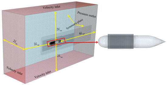 In conformance with International Towing Tank Conference (ITTC) recommendations [32], the computational domain was established with specific dimensional and boundary configurations, as illustrated in Figure 6. The forebody and afterbody maintained a two-length-of-vehicle (Loa) clearance from the inlet boundary and a 4Loa distance from the outlet, respectively. Vertical and lateral clearances from the vehicle’s centroid measured 2 Loa in all directions. Boundary conditions were prescribed as uniform velocity inlet at the upstream and lateral surfaces, hydrostatic pressure outlet at the downstream boundary, symmetry planes for the longitudinal extremities, and no-slip walls for the UUV surfaces. Furthermore, both the geometric model and fluid domain were constructed symmetrically about the vehicle’s longitudinal axis to optimize computational efficiency.