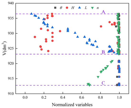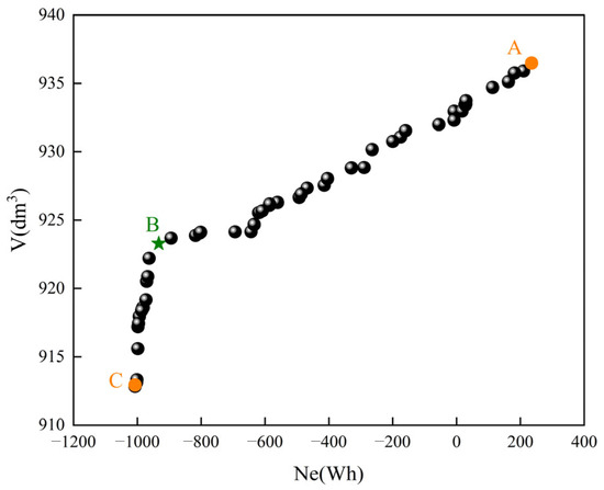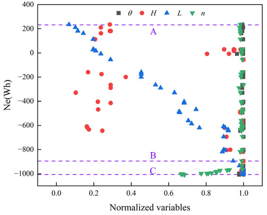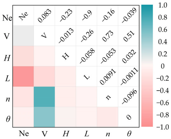 A total of twenty-three distinct sample configurations were systematically generated across the predefined parameter domains by the enhanced Latin hypercube sampling technique. The foundational dataset for subsequent analyses was established with rigorously computed corresponding response metrics. Additionally, a sensitivity analysis was conducted based on the Pearson correlation coefficient to characterize the parameter sensitivity relative to the objective function. The results are presented in Figure 8. Among the dimensional parameters, the length (L) and half-height (H) of the solar array, coupled with the bow-shape coefficient (n), demonstrated pronounced dominance in determining the 24 h energy consumption metric (Ne). Conversely, the remaining parameters exhibited comparatively negligible correlations with this performance indicator. Moreover, the cabin volumetric capacity (V) manifested strong dependency on both the bow-shape coefficient (n) and the stern-shape parameter (θ). Hence, the critical design variables H, L, n, and θ were judiciously selected for progressive optimization procedures.