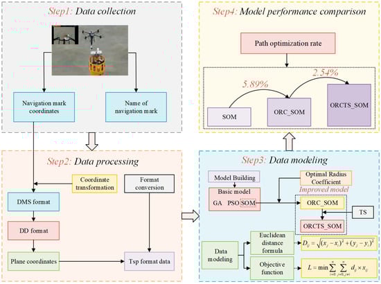 In this study, from data collection, data processing, and data modeling to the comparative analysis of the model operation results, we gradually realized the research on the improved SOM model for the UAV’s navigation mark inspection path planning, and the specific technical route is shown in Figure 1.