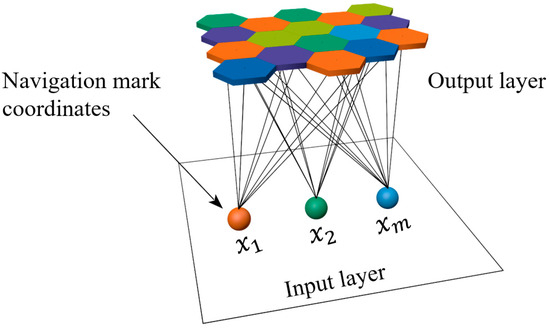 The Self-Organizing Map (SOM) is an unsupervised learning algorithm that maps high-dimensional input data to a low-dimensional topology using a competitive learning mechanism, featuring a network structure that consists solely of an input layer and an output layer, which is referred to as the competitive layer. In a SOM network, neurons are the basic computational units of the network; each neuron has a weight vector for storing and processing information. In the TSP of the UAV inspection navigation mark, the SOM algorithm represents the coordinates of the navigation mark through an input layer whose number of nodes is equal to the feature dimension of the sample. The input layer receives external input patterns, and each input node corresponds to a feature dimension and converges the external information to each neuron in the output layer. The position data of the navigation mark contains two features, longitude and latitude, so the input layer will have nodes equal to the number of these two features. The neurons in the competition layer adjust their weights towards the inputs through competition, and the final adjusted weights represent the paths. The network structure of SOM for navigation mark inspection is shown in Figure 2 below.