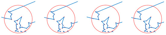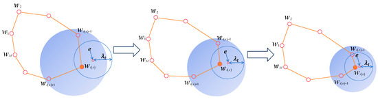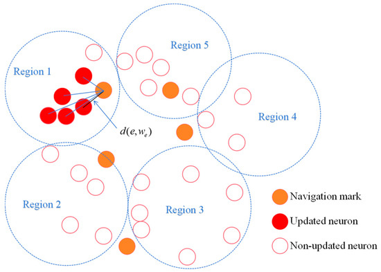With the introduction of the optimal radius coefficient, the improved weight updating mechanism is mainly reflected in the following two cases: the new inputted navigation mark is farther away from or is closer to the winning neuron. The two cases can be briefly illustrated in Figure 3 below, where denotes the inputted navigation mark, denotes the neuron, the orange circle represents the winning neuron, and the shaded part denotes the range of the winning neighborhood of the current winning neuron.