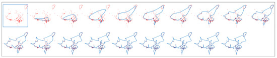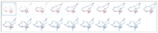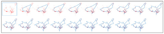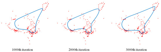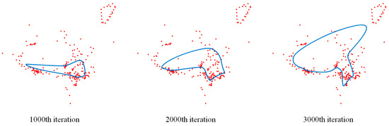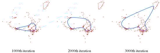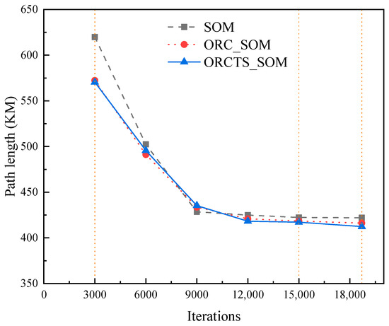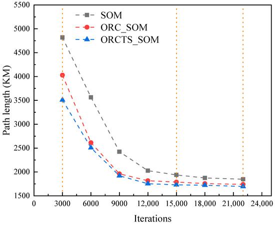 Figure 21 shows the variation in the path planning performance of the three SOM algorithms with the number of iterations on the large-scale navigation mark dataset in Tianjin. The results show that in the first 3000 iterations, the path length of the traditional SOM algorithm is significantly higher than that of two improved algorithms, indicating that its initial search capability is insufficient. As the iteration progresses, the path lengths of the ORC_SOM and ORCTS_SOM algorithms decrease faster, especially in the interval of 6000–12,000 iterations, which shows better convergence speed and optimization. In the final stage (≥15,000 iterations), the ORCTS_SOM algorithm converges to the shortest path and shows the optimal path planning ability, followed by ORC_SOM, both of which are better than the SOM algorithm, which verifies the validity and robustness of the two improved algorithms in large-scale complex scenarios.