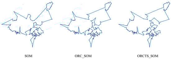 As shown in Table 7, the improved SOM algorithms not only maintain their path planning stability advantages on large-scale datasets, but also more significantly achieve enhanced computational time stability, with ORC-SOM and ORCTS-SOM exhibiting runtime standard deviations (σ = 0.29 s and 1.07 s) that both outperform the standard SOM (σ = 1.24 s). This scale-adaptive characteristic validates that the proposed improvement strategies demonstrate more effective and stable optimization mechanisms in complex problems, confirming their suitability for large-scale maritime navigation mark inspection applications.