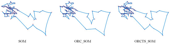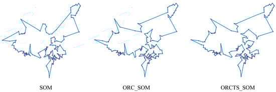 - In terms of path optimization rate, ORCTS_SOM optimization is the best, reaching 2.26%~22.83% and 8.29%~46.51%, respectively; ORC_SOM is the second best, reaching 1.38%~22.13% and 5.89%~45.08%, respectively, in which the ORCTS_SOM algorithm improves by 0.90%~2.54% compared to the ORC_SOM algorithm.