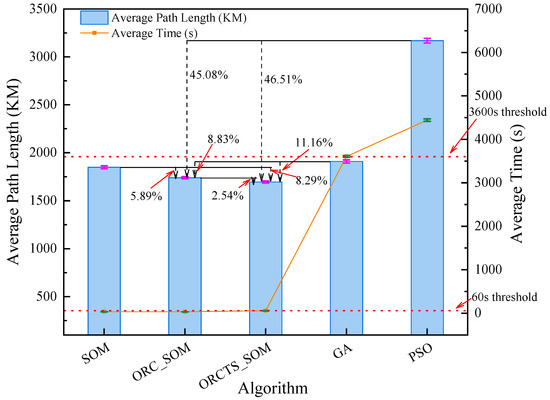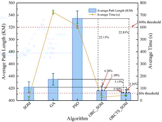 Further comparison of the non-SOM optimization methods reveals that the improved SOM family of algorithms has significant advantages in both path quality and computational efficiency. Among them, the ORCTS_SOM algorithm improves the path optimization rate by 5.15% and 22.83% compared to the GA and PSO algorithms, respectively; the corresponding optimization rate of the ORC_SOM algorithm improves by 4.28% and 22.13%. As for the average running time, the GA and PSO algorithms both exceed 10 min, which is much higher than the requirement of algorithm response speed in practical applications, indicating that their applications are limited in real-time UAV inspection tasks.