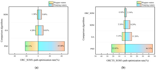 A comparison of the path optimization rates of the two improved algorithms relative to the other algorithms when dealing with navigation mark datasets of different scales is shown in Figure 23 below. It can be seen that in general, the two improved algorithms have better path planning capabilities than the other traditional methods, and the path optimization rates are higher in large-scale navigation mark datasets, in which the path optimization rates of ORCTS_SOM are improved on top of ORC_SOM by 0.90% and 2.54%, respectively.