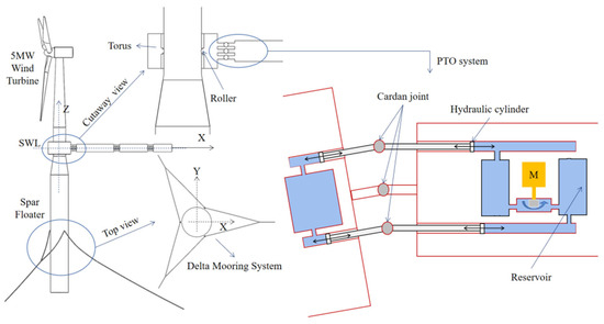 In this study, OC3-Hywind spar [33] is selected as the floating platform, supporting the NREL 5 MW baseline wind turbine [34]. We refer to it as the spar wind turbine or SWT for short. In SWT, the delta mooring system is designed to provide additional yaw stiffness. Taking SWT as a platform, pitch-type WECs are attached to it, through a torus. In this combined concept, the WECs are connected through a rotational hydraulic power take-off (PTO) system. Relative motions in the pitch and yaw degrees of freedom (DOF) are allowed, but with an end-stop system to prevent excessive relative motions. The relative rotations drive PTO rods to actuate hydraulic cylinders, then generate electricity using high- and low-pressure tanks, as depicted in Figure 1. In surge, sway, heave and roll DOFs, they are restrained through mechanical couplings. It is noted that the WECs are connected to each other in series and are designed with different lengths, with the aim to achieve resonance at different wave frequencies and multi-band absorption. A torus is installed along the spar cylinder and is also used to connect the first WEC to the SWT. The relative yaw motions of the spar and the torus are allowed, to achieve the “weather-vane” feature of the WEC system, so that the WECs face the varying incoming wave directions.