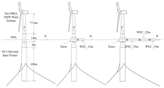 Although the proposed wind–wave combined systems have demonstrated that relatively reduced costs and increased energy output can be achieved, most of them obviously accommodate WECs that resonate within a single or narrow frequency band, i.e., WECs, and are designed to capture wave energy within a specific frequency band. With the aim to achieve multi-band or broad-band energy absorption within frequencies, a novel combined wind–wave energy converter is proposed in this work. This system combines a spar-type floating wind turbine with multi-section pitch-type wave energy converters, inspired by the ‘Pelamis’ concept [32]. However, unlike the ‘Pelamis’, the pitch-type WECs have different lengths in the proposed concept, targeting different resonant frequencies. They are connected to each other in series by a power take off (PTO) system. The first WEC is connected to the cylinder of the spar by a heave-type torus, with the aim to allow the relative yaw motions to make the WECs weather-vaned and to minimize the coupling effects between the wind turbine and WECs.