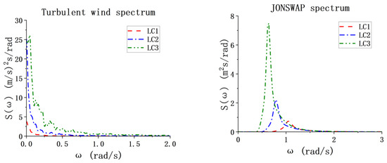 In time-domain simulations, decay tests were firstly carried out to identify the natural periods of the 6 DOFs. Joint wind–wave conditions were studied as key load cases (LCs) that cover the important environmental conditions. Wind velocities were successively considered as 6, 12 and 22 m/s, respectively, to cover the typical operational conditions of the wind turbine in different control regions. The Kaimal spectrum was used with a turbulent intensity of 0.16. The turbulent wind field was generated by Turbsim and covered the entire wind blade swept area. Wave conditions were also increased accordingly with the wind conditions, based on the South China Sea data [49]. The JONSWAP spectrum was used in this study. The LCs are listed in Table 4, specifying the significant wave height (Hs), spectral peak period (Tp) and wind speed at the wind turbine hub height (Uw). From LC1 to LC3, the wind velocities increase, covering the range from below-rated to above-rated wind speeds. The sea states are also increased accordingly. Figure 3 shows the wind spectrum and the wave spectrum of the LCs. A simulation time of 4200 s was adopted, with the last one hour of steady-state data used for analysis.