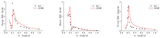 To ensure the correctness and accuracy of the current simulations, preliminary verification was carried out based on the comparison of motion RAOs of the SWT from the simulation in this work and the model test data from ref. [50]. Time-domain results on surge, heave and pitch motions are shown in Figure 4, respectively. The red lines represent the results obtained in this study, while the black dots are the results derived from the data in the reference. It is noted that the results of the model test do not contain data in frequencies below 0.2 rad/s; therefore, the numerical simulation results in the reference are used.