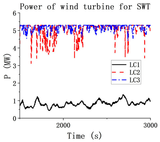In order to facilitate the comprehensive and accurate comparisons of the dynamics for the three models, the PTO damping of C = 500 kN·ms/deg is employed in this section. The power output of the wind turbine for the three models under three loading conditions (LCs) is shown in Figure 6. As can be seen from Figure 6, the output power of the wind turbines for the three models remains nearly the same, indicating that the WECs have barely any influence on the wind turbine’s output power. Meanwhile, Figure 7 presents the output power time series of the wind turbine for the SWT. It can be seen that the power output is in line with the applied wind conditions, i.e., 5 MW for LC2 and LC3, while for LC1, the wind power output is much smaller. These results indicate the negligible effects from the WECs.