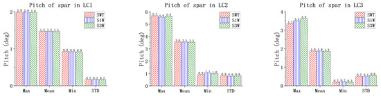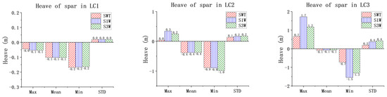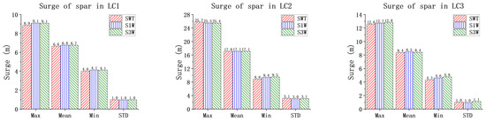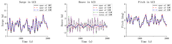 Figure 8, Figure 9 and Figure 10 illustrate the motion characteristics of the spar for the three models in the three LCs, to investigate the impact of the WEC on the floating wind turbine. It can be clearly observed from Figure 8 and Figure 10 that, under all loading conditions, the surge and pitch motions of the spar for the combined concepts exhibit some variations compared to those for the SWT. However, these differences are relatively small in terms of statistical values. It can be concluded that the presence of the WECs has little effect on the surge and pitch motions of the spar. To ensure the clear presentation of the data, Table A1, Table A2 and Table A3 in the Appendix A provide the relevant statistical values.