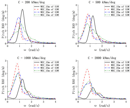 Figure 10 illustrates that the pitch RAO trends for the three floating bodies of the three-section WEC are relatively close. This similarity is attributed to the mechanical coupling effect through the interconnected PTO systems. However, the frequencies corresponding to the peaks are notably different, affirming the multi-band absorption capability of the three-body WEC model, i.e., due to the differing dimension of each WEC. There are differences between the pitch RAOs of the three-section WEC and the one-section WEC. This difference is likely caused by the different layouts of the WECs in S1W and S3W. In addition, the range of the pitch RAO for the three-section WEC is significantly larger than that of the one-section WEC. As the value of C changes, the peaks of RAOs of the WEC bodies with lengths of 25 m and 15 m also vary, highlighting the impact of PTO damping on the dynamic characteristics of the system of multi-section WECs.
