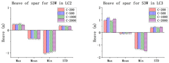 It is necessary to further study the impact of the PTO damping on the system dynamics, based on the findings in Section 5.2, which determined that the presence of the WEC has a minimal impact on the surge and pitch motions of the spar, and a slight effect on its heave motion under LC1. Given this, this section will focus solely on comparing and analyzing the results of the heave motion of the spar for the combined concepts under higher sea states. Figure 14 and Figure 15 present the statistical values of the heave motion of the spar for the combined concepts under LC2 and LC3. To ensure the clear presentation of the data, Table A4 and Table A5 in the Appendix A provide the relevant statistical values.