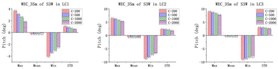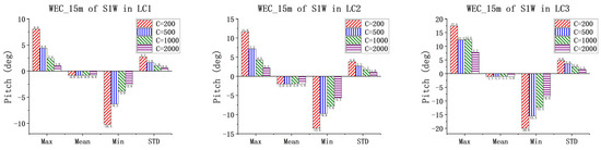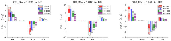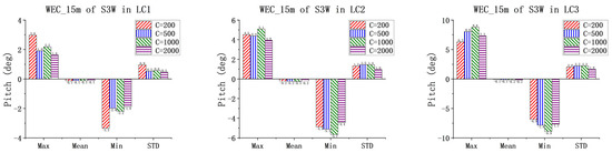 Figure 16, Figure 17, Figure 18 and Figure 19 present the pitch motions of WECs for the combined concepts under three LCs. Under the same condition, the pitch motion amplitudes of floating bodies of the three-section WEC are basically smaller than those of the one-section WEC. As the severity of the sea states increases, the motions of the WECs increase significantly, which is reasonable. In addition, an obvious trend is that with increasing PTO damping, the WEC pitch dynamics decrease, with little exceptions for WEC_15 in the S3W model. One possible reason is that WEC_15 is in the free-end of the three-section WEC, and it is influenced significantly by the adjacent WEC, i.e., WEC_25. To ensure the clear presentation of the data, Table A6, Table A7, Table A8 and Table A9 in the Appendix A provide the relevant statistical values.