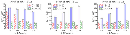 PTO damping, which is denoted as the parameter ‘C’ here, is a critical parameter that significantly influences the wave energy capture efficiency and the dynamic responses of both wave energy converters (WECs) and floating wind turbines. Before comparing and analyzing the three models, it is imperative to perform an initial assessment of the PTO damping to identify the optimal damping values. This preliminary analysis is essential for understanding the impact of the C, and for determining its optimal range. Such an analysis enables a precise evaluation of the dynamic responses across the models, as well as an in-depth analysis of their motion and power spectrum.