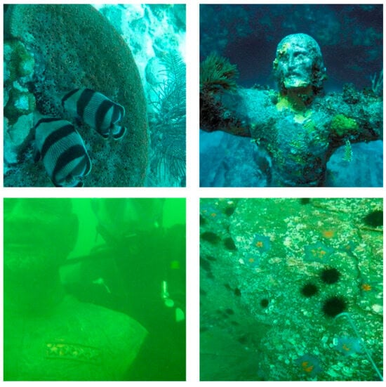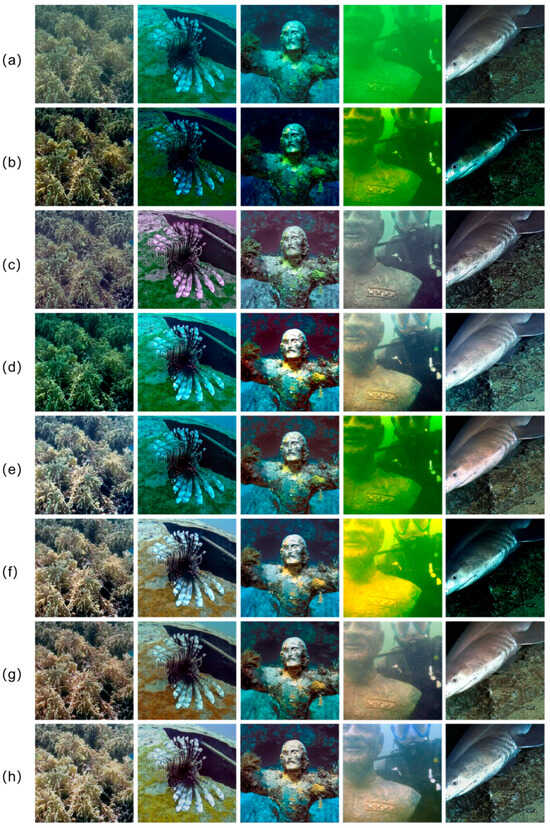 The ocean’s abundant resources and biodiversity have established it as a strategically vital region for all nations. Underwater imaging plays a pivotal role in uncovering critical features such as seabed topography, sediment distribution, and biodiversity patterns. The effective exploration of marine resources and the assessment of ecosystem health depend on high-quality underwater imagery to support scientific research and inform engineering decision-making. However, the complex and dynamic underwater environment considerably alters light propagation, presenting major challenges for imaging systems. As shown in Figure 1, intense scattering and absorption in seawater generate blue-green channel shifts and contrast reduction, resulting in substantial image quality degradation []. This deterioration not only impairs visual clarity but also obstructs tasks such as target detection, identification, and 3D reconstruction. Consequently, underwater image enhancement (UIE) techniques, aiming at rectifying color casts and enhancing contrast, have garnered significant attention and extensive research [].