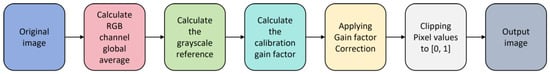 The gain factor quantifies required compensation: if a channel’s mean intensity is below the target gray level (for instance, the red channel under a blue-green cast), exceeds unity to boost its response; otherwise, attenuates the channel. The corrected image is generated by applying these channel-specific gains to each pixel: