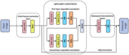 Although dynamic color correction mitigates color casts, the enhanced image often exhibits persistent low contrast and blurred details due to residual degradation. To address these limitations, a lightweight residual enhancement network based on SRResNet is proposed, as illustrated in Figure 4. The residual network integrates three key design principles: depthwise separable convolutions to reduce computational costs to approximately 1/8 of standard convolutional operations; a dual attention mechanism to amplify salient features; and residual connections to maintain information flow while mitigating gradient vanishing, thereby rendering the network suited for underwater image enhancement tasks that demand high-fidelity detail preservation.