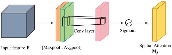 Figure 6 shows the structure of spatial attention. AvgPool and MaxPool represent channel-wise global average pooling and global max pooling operations, respectively, which aggregate spatial information by computing mean and maximum statistics across spatial dimensions. Their concatenated outputs are processed through a convolution followed by the activation of to generate the spatial attention map. This dual attention design enables simultaneous focus on critical feature channels and spatial locations, enhancing feature discriminability. The enhanced features are fused with the original input through the residual concatenation as follows: