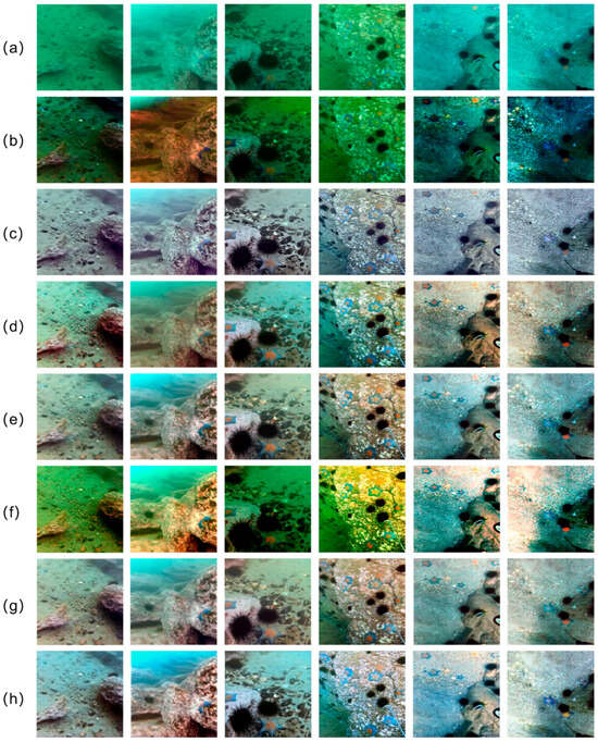 Enhancement results on the RUIE dataset. (a) RAW input; (b) UDCP []; (c) MLLE []; (d) DICAM []; (e) FA+Net []; (f) DeepWater []; (g) PUIE-Net []; (h) proposed method.