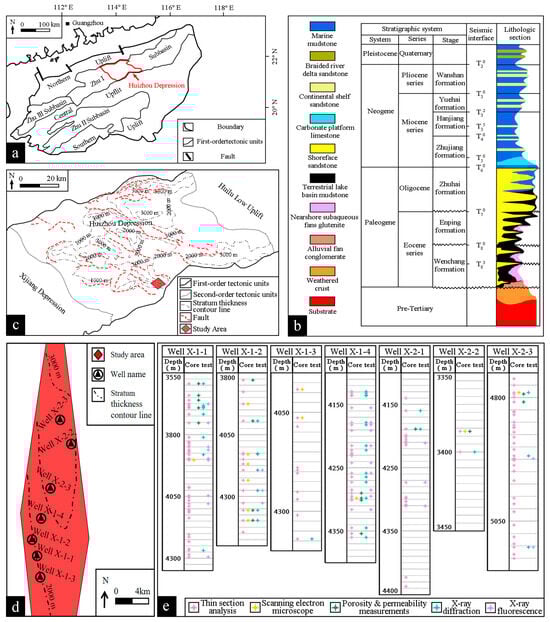 General Situation of the study area: (a) the Pearl River Mouth Basin; (b) geological map of Huizhou Depression; (c) drilling location; (d) X-1 and X-2 well areas; (e) sampling information.
