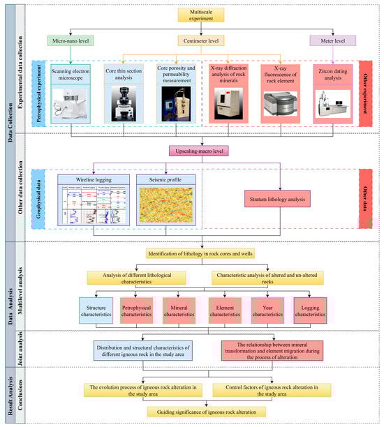 After determining the lithological information of the sample based on rock thin sections, typical rock cores of different lithologies were selected to carry out the above-mentioned multi-scale data collection work. These analyses aim to elucidate geological ages, physical properties, rock textures, mineralogy, and chemical compositions using multi-scale data. The combination of petrophysical and mineralogical data can be used to analyze the relationship between mineral changes and changes in rock porosity and permeability caused by different alteration. Mineralogy and elemental analysis can provide reliable evidence for the migration patterns of elements during alteration processes. The combination of laboratory core data and well data can restore the lithological distribution characteristics in the formation. By incorporating rock age information and up-scaling seismic data, this article can utilize multi-scale data to study the relationship between alteration characteristics and Earth activity.