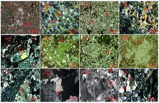 The cross-polarized light thin sections of 149 cores from X-1 and X-2 well areas in the Huizhou Depression, Pearl River Mouth Basin, northern part of the South China Sea, indicate a diverse assembly of igneous rocks, ranging from mafic to felsic rock types (Figure 3). Signs of alteration are observed in approximately half of the samples. Notably, granite exhibits both hydrothermal and weathering alterations. This comprehensive examination has led to the categorization of the core samples into 12 distinct types: 10 samples of diorite, 32 tectonic schists, 2 diabase, 10 altered diabase, 4 basalt, 2 altered basalt, 31 andesite, 21 altered andesite, 14 granite, 5 altered granite, 6 weathered granite, and 12 granodiorite.