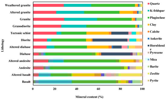 This study primarily observes hydrothermal alteration, with some instances of weathering. Altered rock types include diorite, diabase, basalt, andesite, and granite, with granite undergoing both hydrothermal alteration and weathering while hydrothermal alteration and metamorphism for diorite. The extent and nature of alteration vary significantly due to the composition of the original rocks and changes in external environment [1]. The degree of alteration is commonly assessed by the content of clay minerals in the altered rocks [57]. In this study, the clay minerals identified in altered core samples are predominantly chlorite and illite, with their content generally ranging between 10 and 30%, indicating moderate alteration.