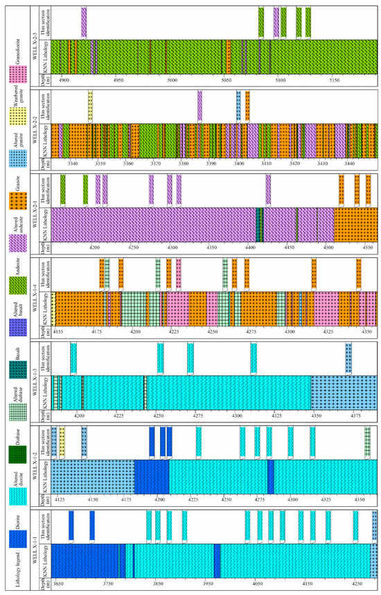 The lithology results based on KNN show that Wells X-1-1, X-1-2, and X-1-3, located in the southwest of the Huizhou Depression, exhibit a similar lithology, primarily consisting of altered diorite, diorite and altered granite, with interbedded thin layers of intruding altered diabase (Figure 5). The alteration within these wells is notably pronounced at depths ranging from 3800 to 4375 m. Well X-1-4, with its depth range of 4150 to 4350 m, mainly contains granodiorite, granite, and altered diabase with a lesser presence of altered and weathered granite. The X-2 series wells, situated in the northeast of the Huizhou Depression, span from 3300 to 5200 m depth, and have granite, andesite, altered andesite and basalt. Among these, Well X-2-1 mainly features altered andesite, interbedded with thin layers of basalt, and underlying granite. Well X-2-3 is dominated by andesite, and Well X-2-2 contains a variety of igneous rocks in interlayered forms.