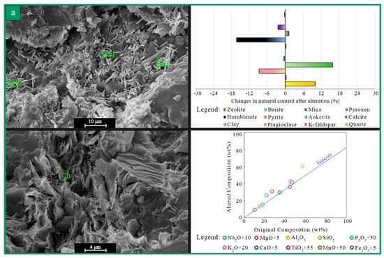 Altered rocks contain significantly more clay minerals than their unaltered counterparts. These clay minerals replace other mineral phases, demonstrating extensive alteration processes throughout the study area. Unaltered diorite consists primarily of hornblende (31.87%) and plagioclase (31.70%), with smaller quantities of quartz (12.73%), zeolite (3.23%), and minor clay minerals (4.67%). Tectonic schist (diorite’s altered equivalent) shows a sharp decrease in hornblende (15.57%) and plagioclase (22.97%), while hosting substantially more clay minerals (20.57%). This study consistently documents reduced primary minerals alongside increased clay content across multiple rock types, highlighting the transformative impact of alteration processes (Figure 4).