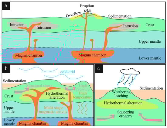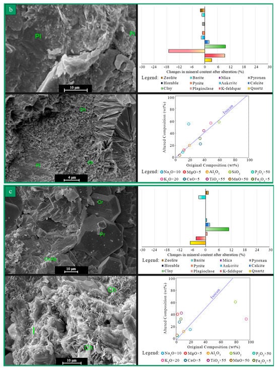 The SEM results indicate that the clay in rocks experiencing hydrothermal alteration are predominantly sheet-like or petal-shaped chlorite and fibrous illite, the mineral combination of hydrothermal alteration in diorite is hornblende–plagioclase–mica (Figure 6a), in andesite is plagioclase (Figure 6b), in granite is K-feldspar alteration (Figure 6c), and granite weathering is accompanied by dissolution of K-feldspar and carbonate minerals (Figure 6d). This is consistent with the changing characteristics shown in mineralogical data. It is worth noting that SEM images and core mineral analysis did not show significant presence of kaolinite. Studies show that the temperature conditions favoring the formation of chlorite are lower than those required for kaolinite [58]. Additionally, chlorite and illite serve as indicators of a dry and cool climate [59,60]. This alteration feature, which is mainly composed of chlorite and illite, supports the study area being in a dry and cool climate during the alteration process, and a detail future basin models should integrate to predict clay-dominated alteration.