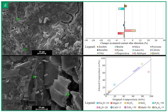 SEM images of selective core samples and corresponding Isocon plots (for each image, the upper left and lower left show SEM images of unaltered rocks and altered rocks, respectively; the upper right figure outlines the mineralogical changes after alteration, and lower right presents Isocon diagrams, detailing the elemental migration patterns due to alteration. Hbl in the SEM images represents hornblende, and Ab, Ch, Pl, Or, Pr are for albite, chlorite, plagioclase, K-feldspar and pyrite, respectively): (a) diorite; (b) andesite; (c) altered granite; and (d) weathered granite.